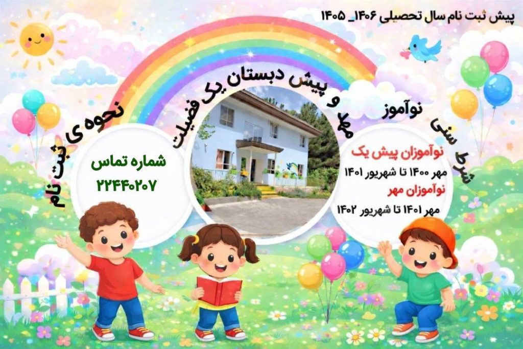 باسمه تعالی آغاز ثبت نام پیش دبستان ۱ فضیلت پیشثبتنام پیشدبستان یک فضیلت آغاز شد! فضایی شاد، آموزنده و مذهبی برای فرزندتان ثبتنام از طریق لینک زیر می باشد: لینک ثبت نام پیش دبستان ۱ لینک کانال بله شماره تماس: ۲۲۴۴۰۲۰۷